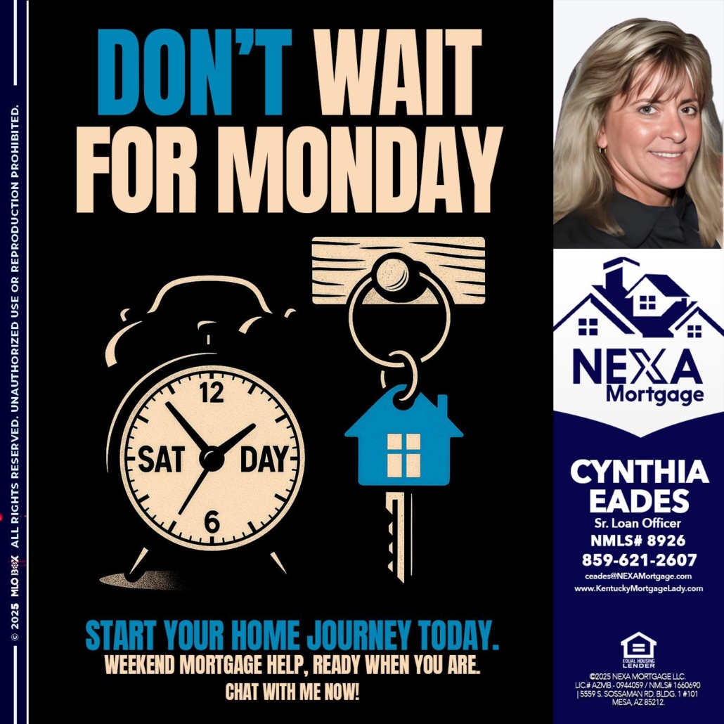 Hi, my name is Cynthia Eades. I’m a Loan Officer with NEXA Mortgage LLC., offering personalized mortgage solutions, fast customized quotes, great rates and service with integrity.