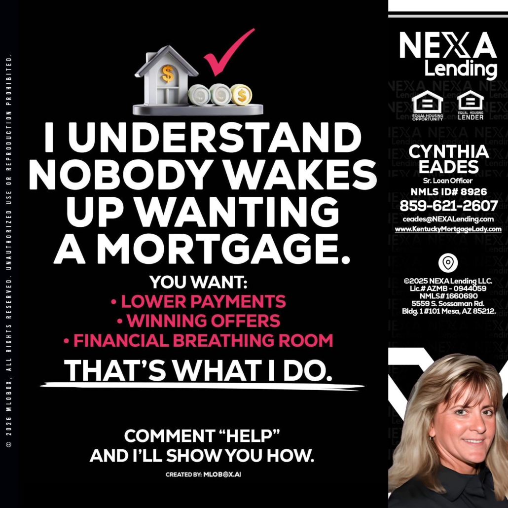 I UNDERSTAND - Cynthia Eades -Sr. Loan OfficerHi, my name is Cynthia Eades. I’m a Loan Officer with NEXA Lending LLC., offering personalized mortgage solutions, fast customized quotes, great rates and service with integrity.