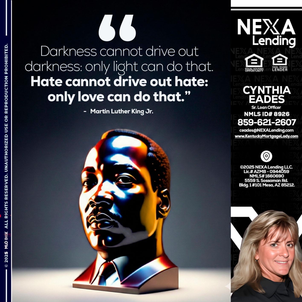 MLK 2026 - Cynthia Eades -Sr. Loan OfficerHi, my name is Cynthia Eades. I’m a Loan Officer with NEXA Lending LLC., offering personalized mortgage solutions, fast customized quotes, great rates and service with integrity.