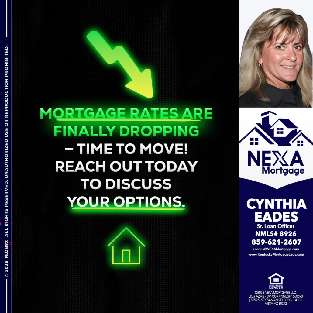 Hi, my name is Cynthia Eades. I’m a Loan Officer with NEXA Mortgage LLC., offering personalized mortgage solutions, fast customized quotes, great rates and service with integrity.