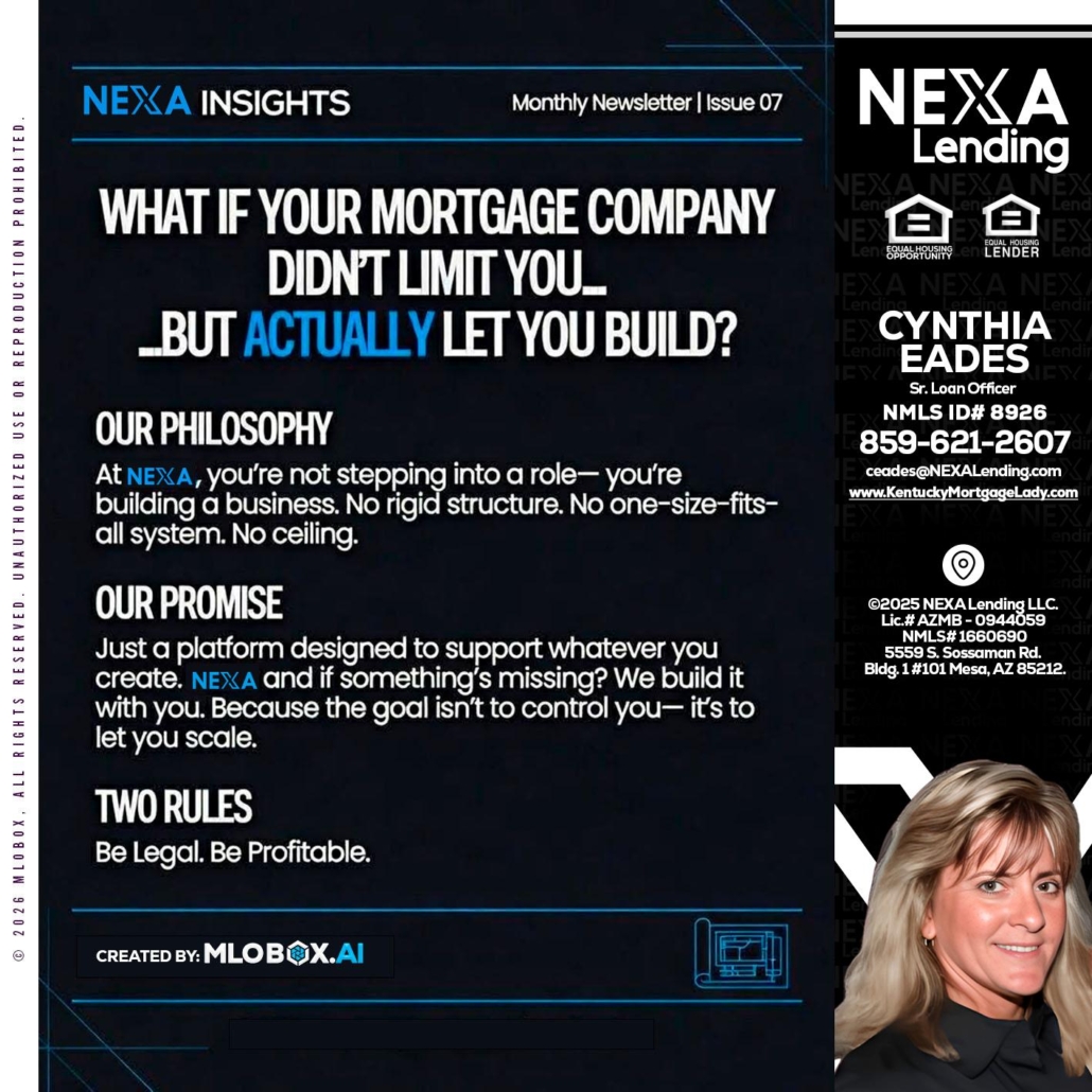 Hi, my name is Cynthia Eades. I’m a Loan Officer with NEXA Lending LLC., offering personalized mortgage solutions, fast customized quotes, great rates and service with integrity.