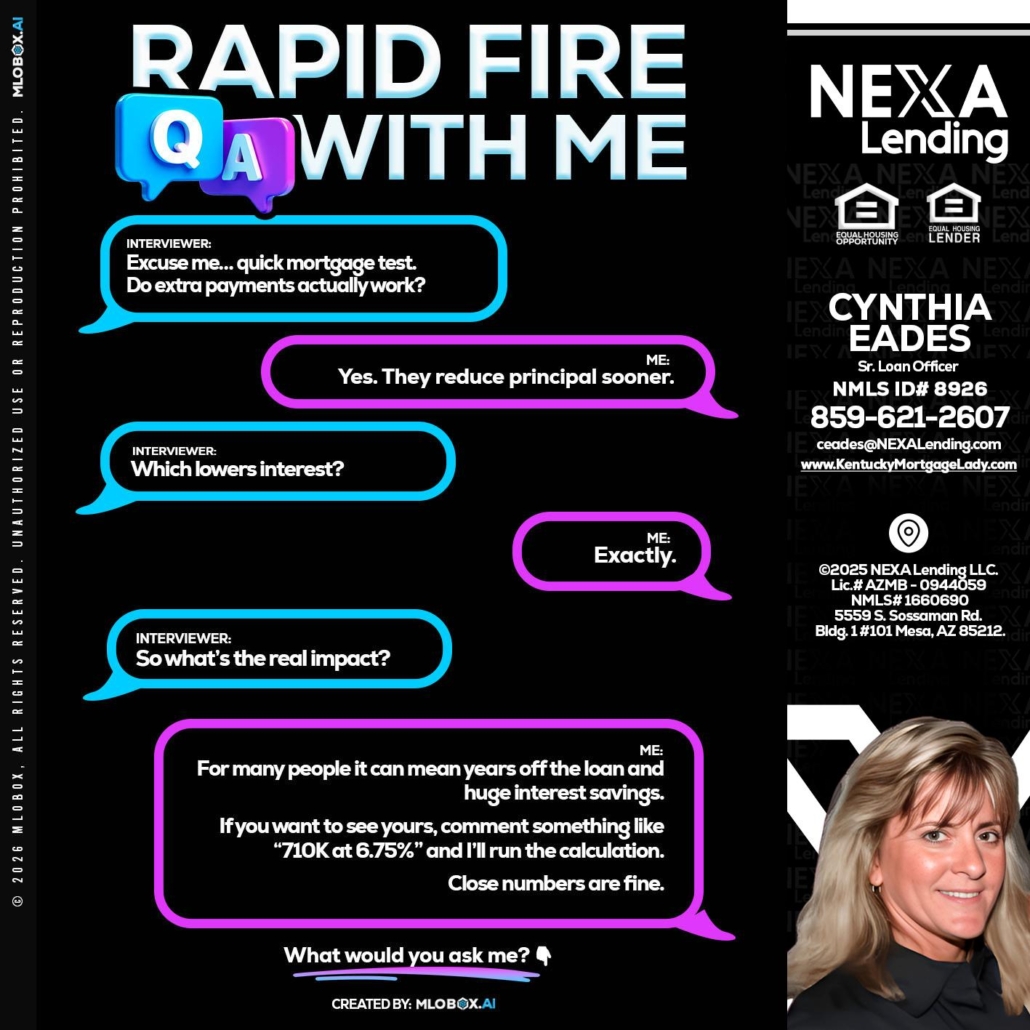 RAPID QA - Cynthia Eades -Sr. Loan OfficerHi, my name is Cynthia Eades. I’m a Loan Officer with NEXA Lending LLC., offering personalized mortgage solutions, fast customized quotes, great rates and service with integrity.